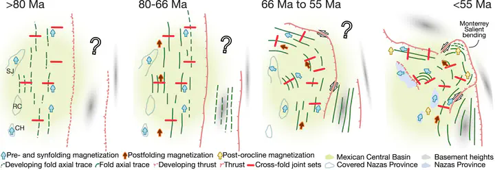 Simplified kinematic reconstruction of the Sierra Madre Oriental OroclineThe Sierra Madre Oriental belt of the Mexican thin-skinned fold-and-thrust belt, which formed during the Late Cretaceous due to the subduction of the Farallon Plate beneath North America, exhibits a pronounced curvature of approximately 100°, concave to the southwest. A recent paleomagnetic study in Jurassic rocks has classified the curvature of the Sierra Madre Oriental as an orocline. However, orocline formation remains loosely dated as syn-to post-orogenic, ranging from 120 to 50 Ma, which is the timing of the main deformation in the region. This poorly constrained kinematics prevented proposing a mechanism for the oroclinal bending, leaving both the tectonic driver and kinematics unresolved. In this study, we investigate the Cretaceous Taraises Formation along the curvature of the Sierra Madre Oriental Orocline to unravel its kinematics of formation. Our new paleomagnetic data set, along with joint-set analysis in 25 anticlines, allows for fold-tests and reveals pre-, syn-, and post-folding magnetizations that indicate ∼90° counterclockwise rotations with respect to the north, in the northern limb of the orocline and ∼30° clockwise rotations in its southern limb. Paleomagnetic data constrain the timing of the oroclinal bending to the Paleocene (66–55 Ma), which is later than the main thin-skinned folding event in the area.